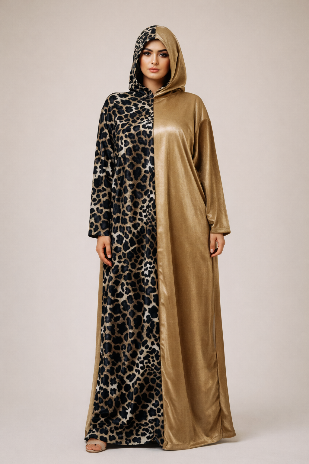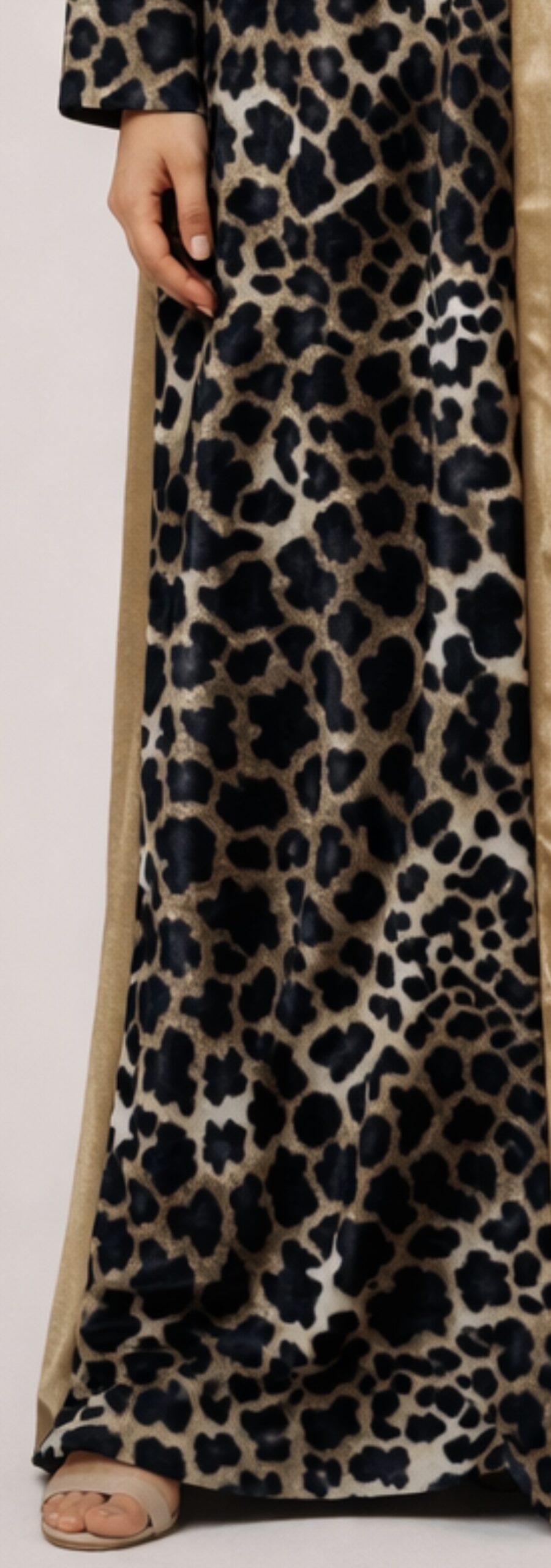 تصميم مميز بنص ليوبارد ونص ساده لون ذهبي، خامة قطيفة ناعمة وفخمة، مريح جدًا ومناسب للصلاة واللبس اليومي في رمضان لحد ٨٥ كيلو