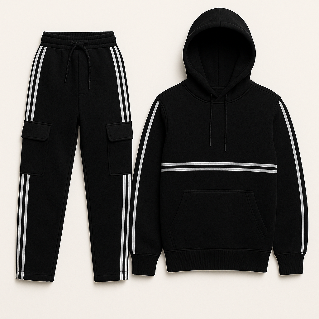 ترنج اطفالي أسود بخطوط بيضاء رياضية ريفلكت – هودي وبنطلون