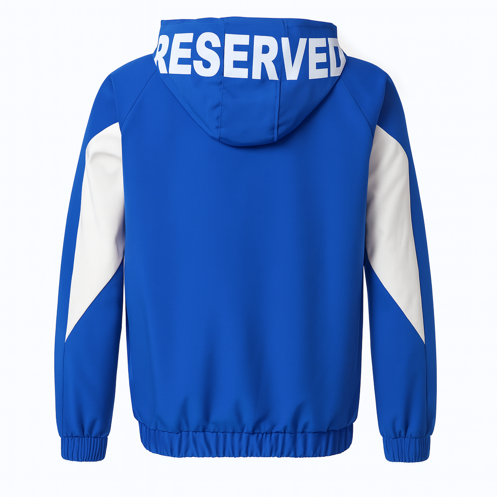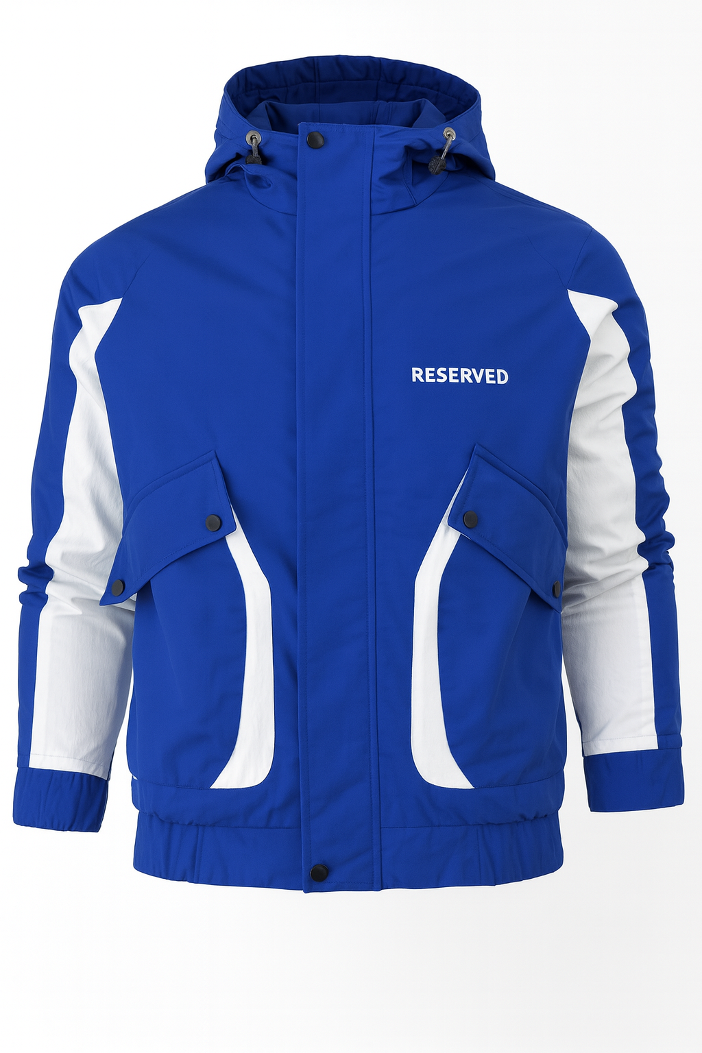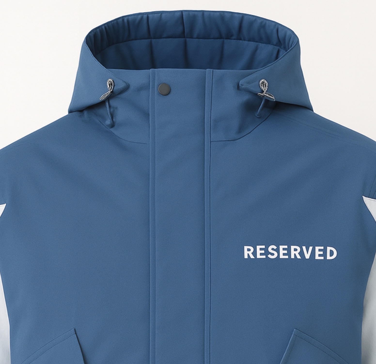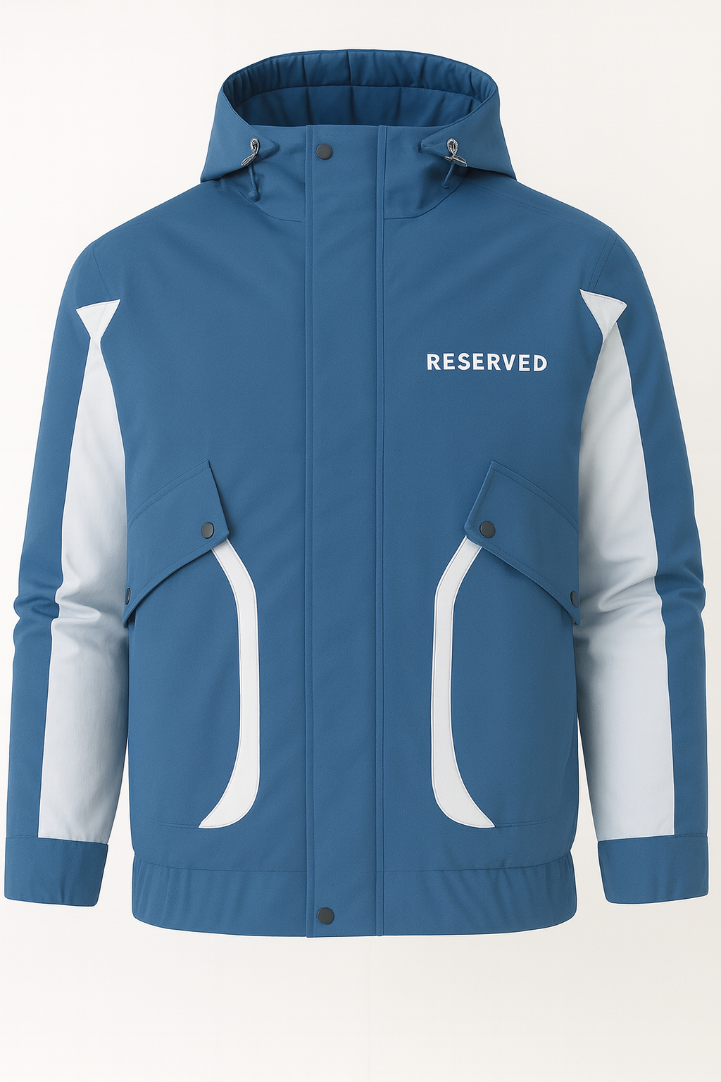 جاكت شتوي RESERVE خامة قوية ضد الهوا والمطر، بلون Deep Ice Blue المميز، تصميم عملي بجيوب كبيرة وتفاصيل بيضاء رايقة.