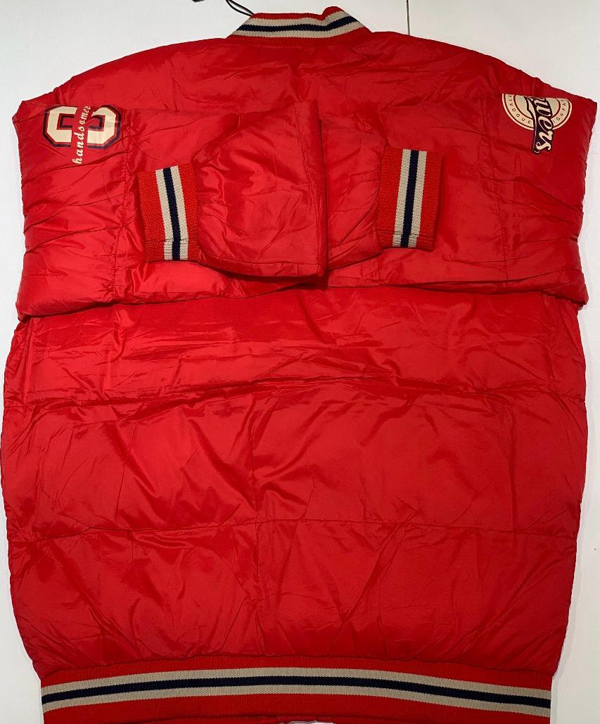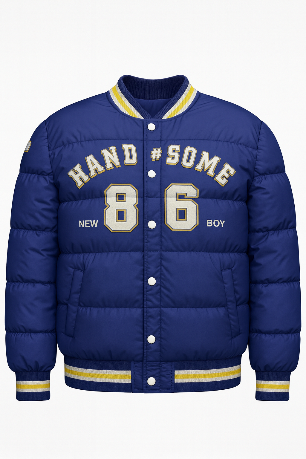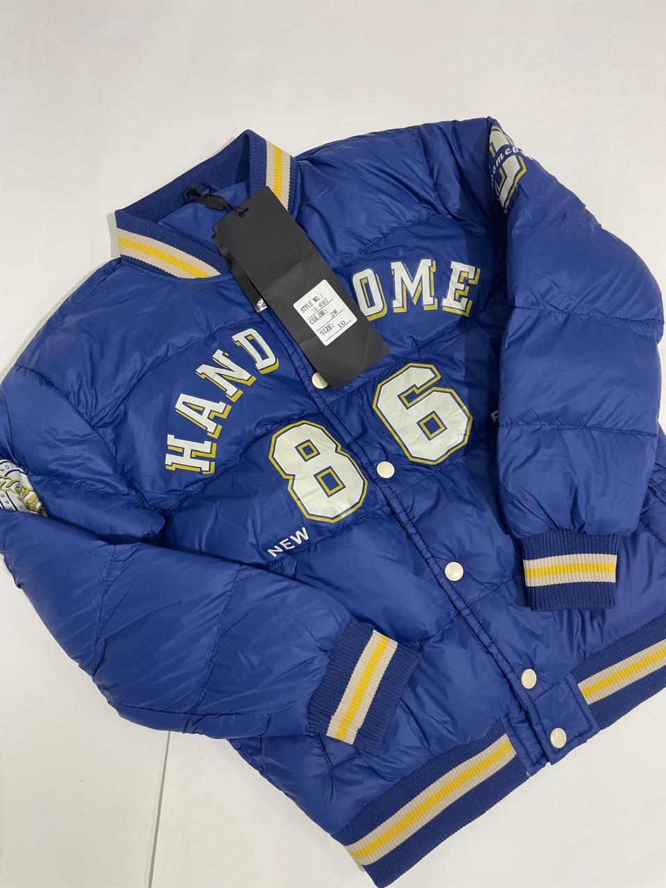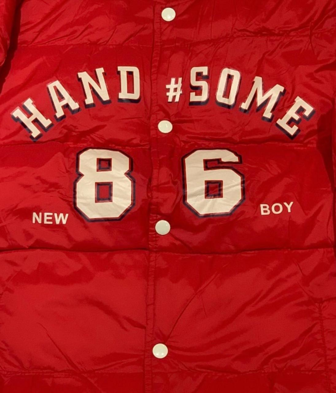 جاكت شتوي أولادي بخامة عالية الجودة، تصميم رياضي أنيق يحمل شعار Handsome 86. متاح باللونين الأزرق والأحمر.