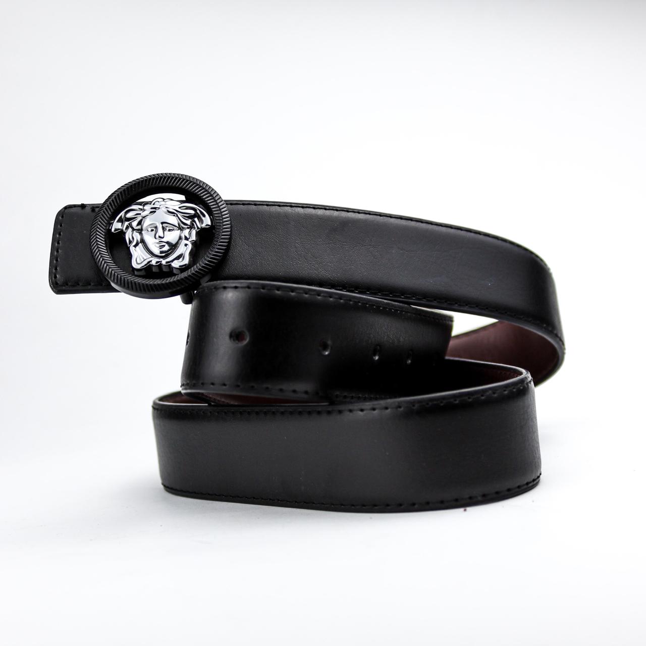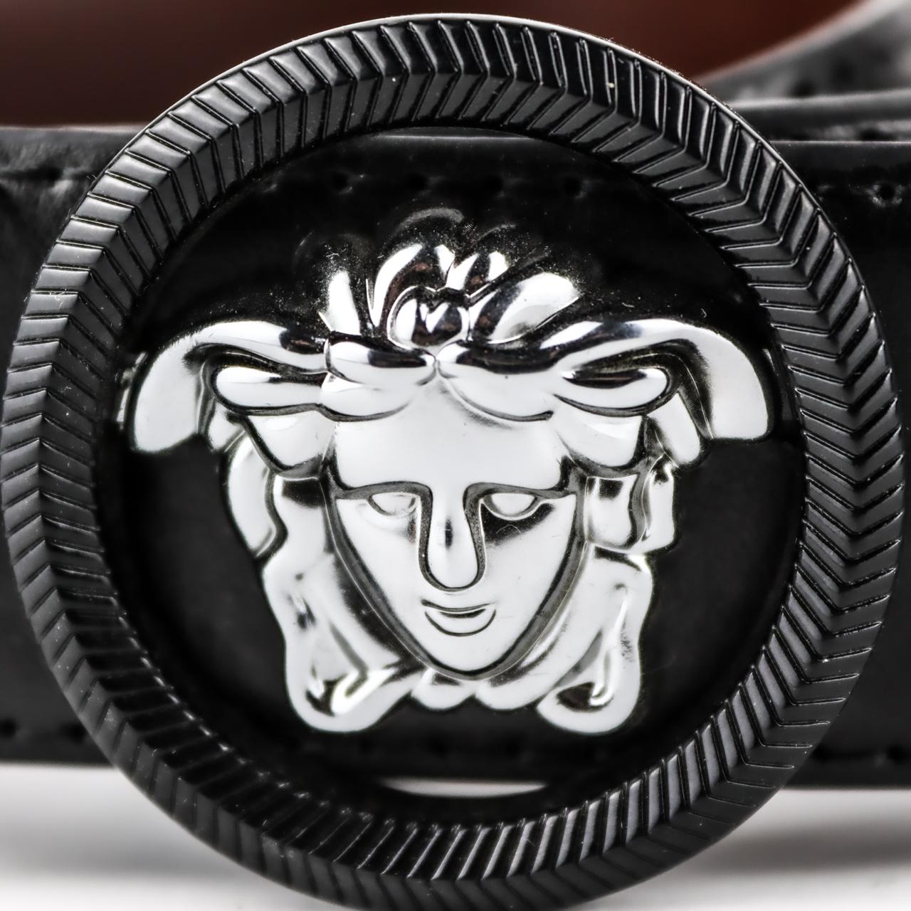 حزام Versace مستورد من الجلد الأسود الفاخر، مزود بإبزيم معدني أنيق يحمل شعار ميدوسا الأيقوني، لمظهر كلاسيكي راقٍ.