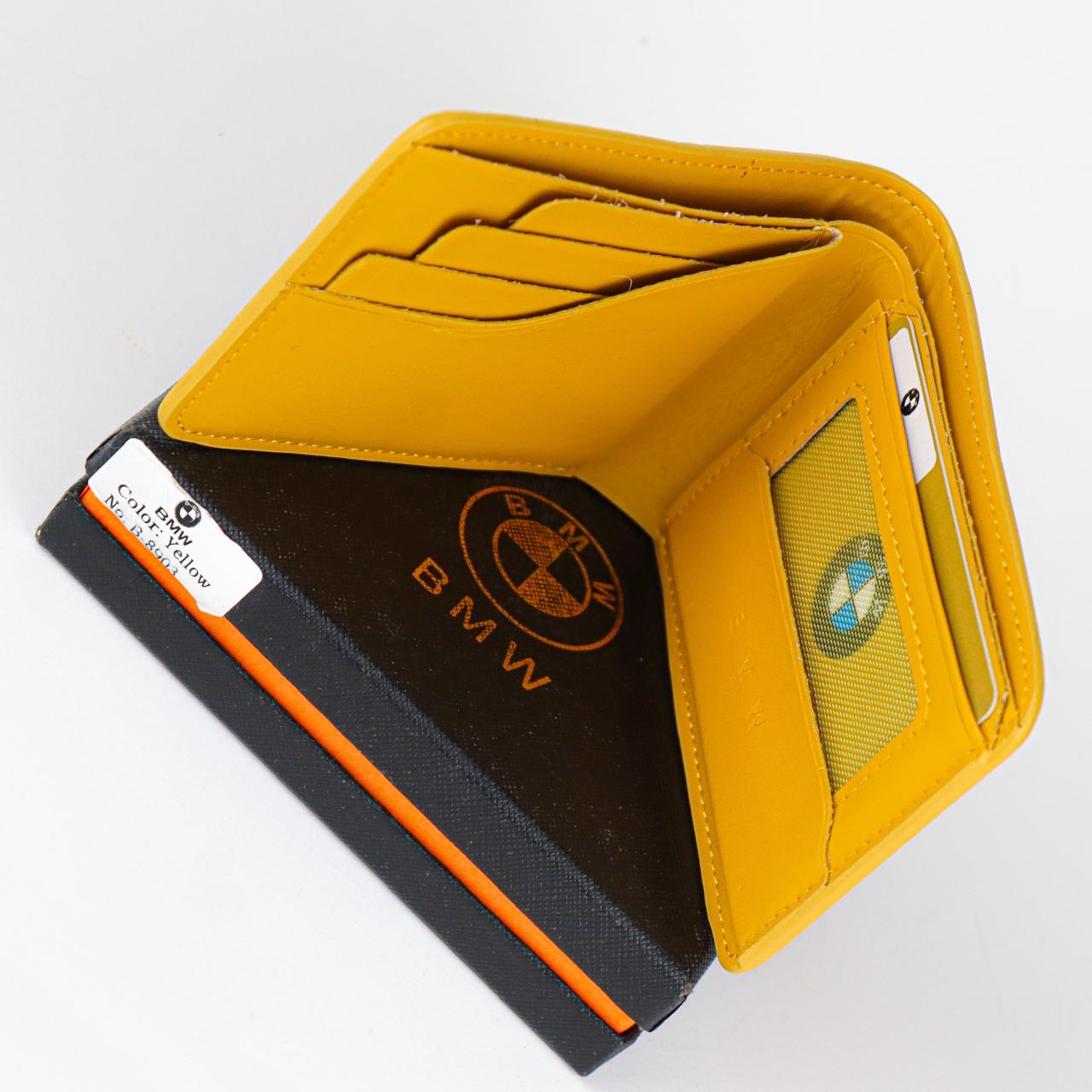 محفظة BMW رجالي جلد طبيعي باللون الأصفر المميز، تصميم فاخر مع شعار BMW المعدني، تجمع بين الأناقة والجودة العالية، مناسبة للهدايا والاستخدام اليومي.